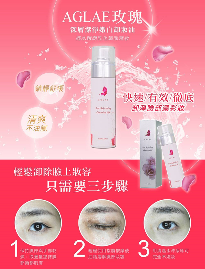 雅葛蕾的玫瑰深層潔淨嫩白卸妝油採特殊乳化技術,不須沾水就可以將彩妝卸得乾乾淨淨喔!
